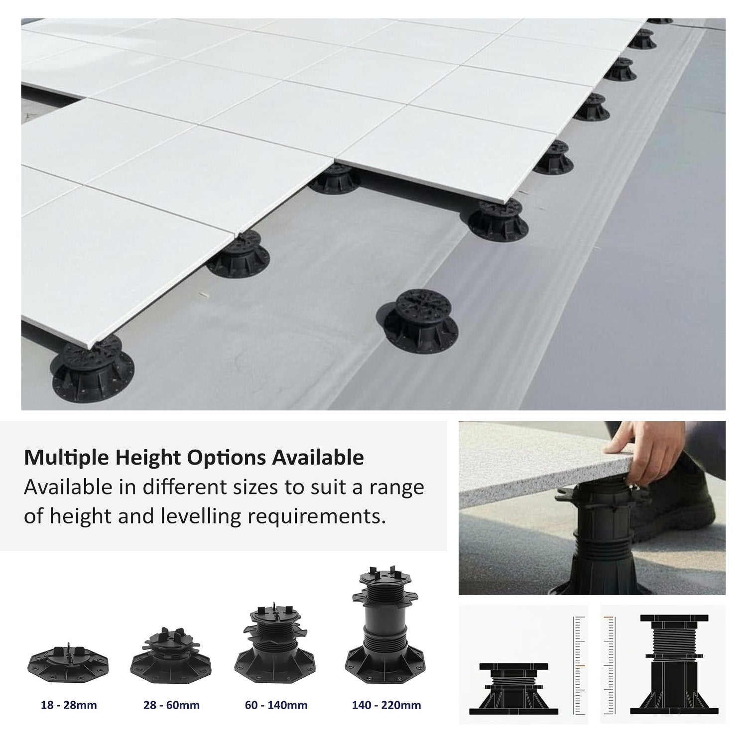 Select the correct height range for your project and achieve a strong, level, and long-lasting tiled or paved surface with ease.