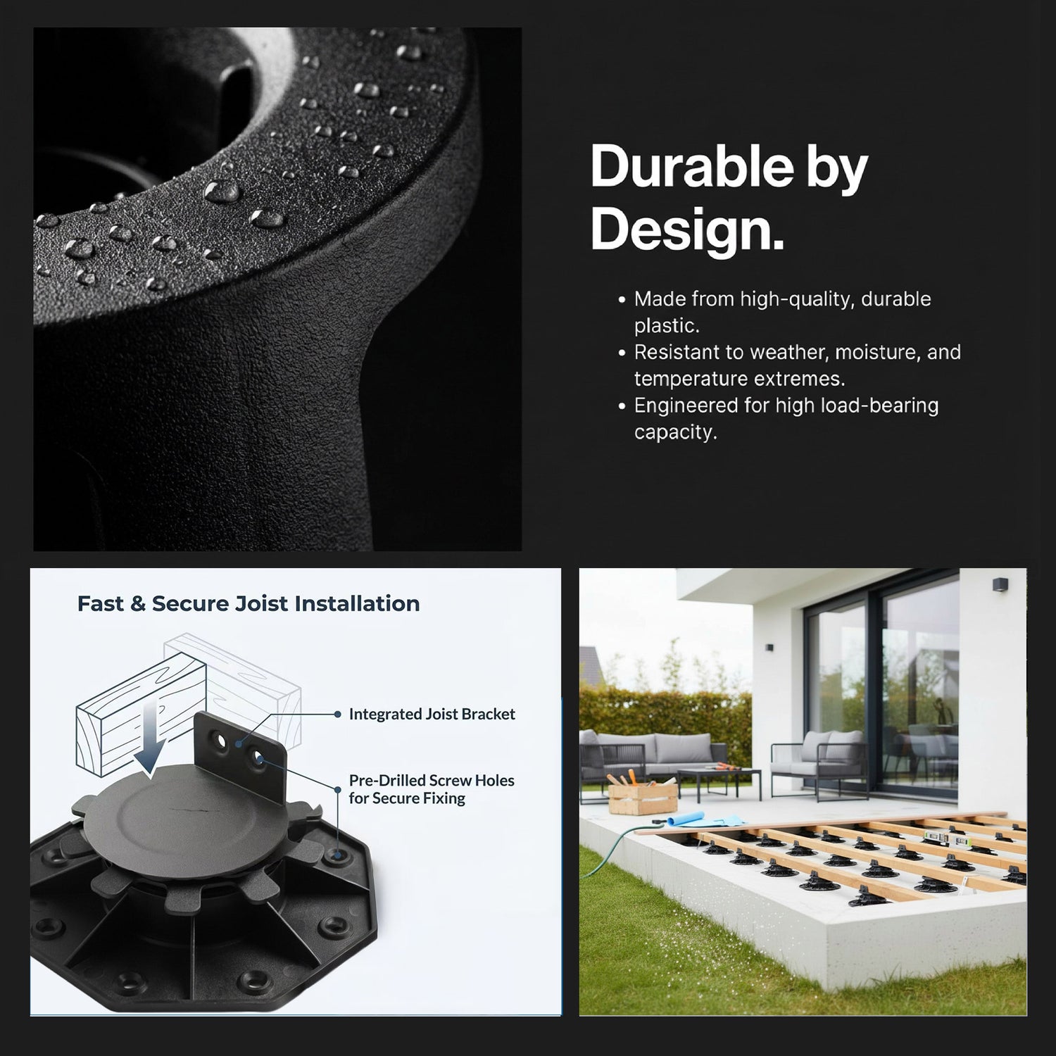 Create a strong, level, and long-lasting foundation for your outdoor projects with our adjustable decking pedestal riser supports. Designed for precision height adjustment and durability, these pedestals are ideal for decking, patios, paving slabs, and garden shed bases — even on uneven ground.